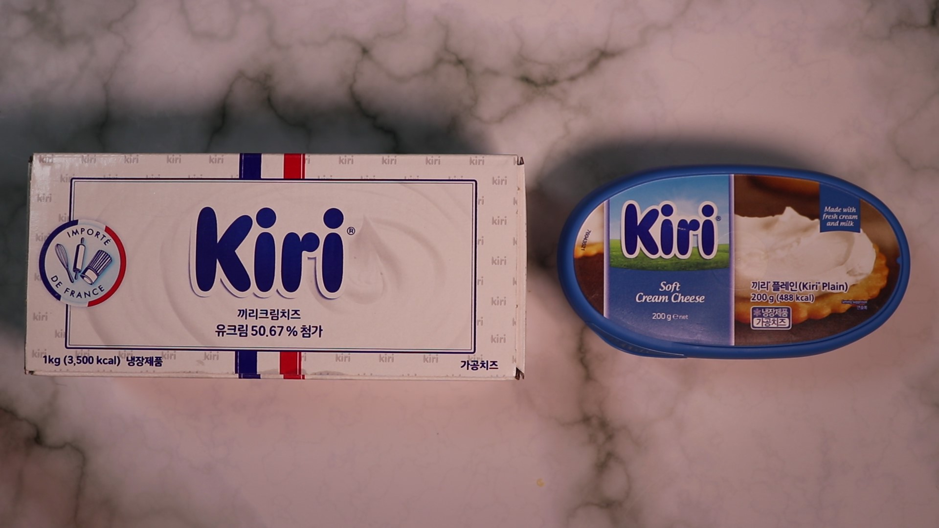 사실 끼리 크림치즈도 여러 종류가 있는데요. 그 중 대표적으로 스프레드 용도로 나온 크림치즈와 단단한 벽돌형의 크림치즈가 있습니다. 같은 크림치즈이지만 이 두 종류의 텍스쳐는 전혀 다른데요. 스프레드용 크림치즈는 좀 더 부드럽고 묽은 느낌이라면 벽돌형은 굉장히 뻑뻑하고 단단한 느낌입니다. 실제로 실온상태의 크림치즈를 풀어줄 때 그 차이를 확연히 느낄 수 있습니다.